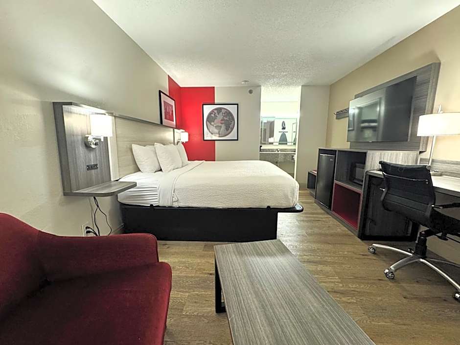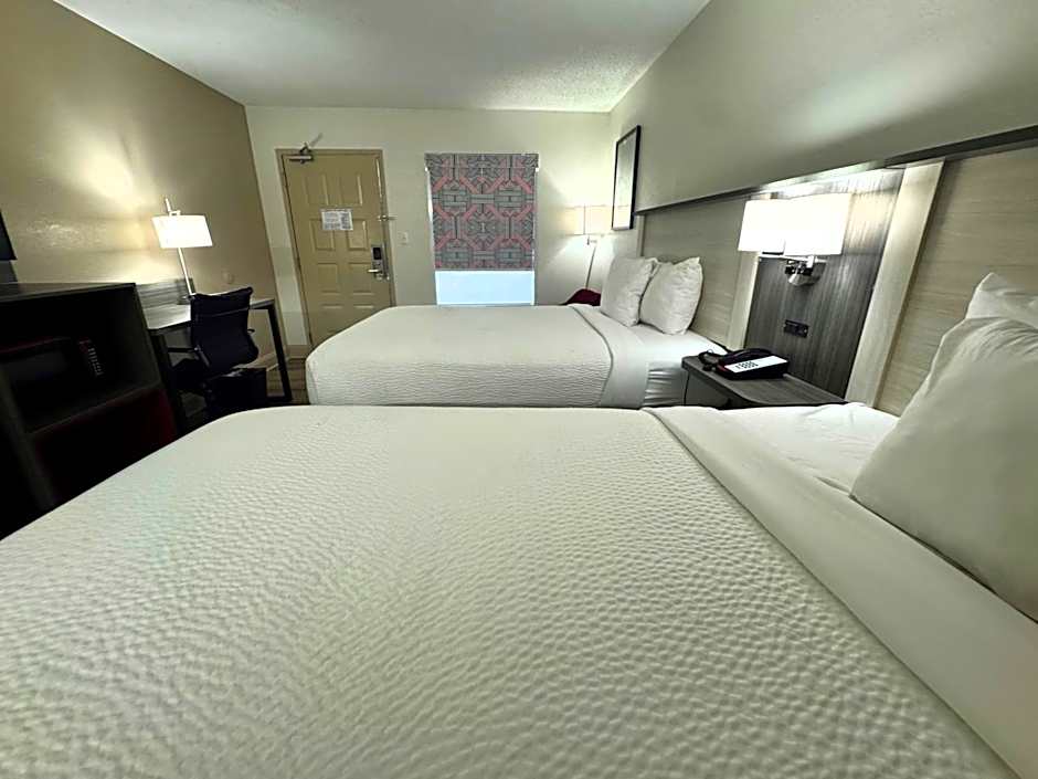 Room features a 32-inch flat-screen TV, a microwave and a small refrigerator.